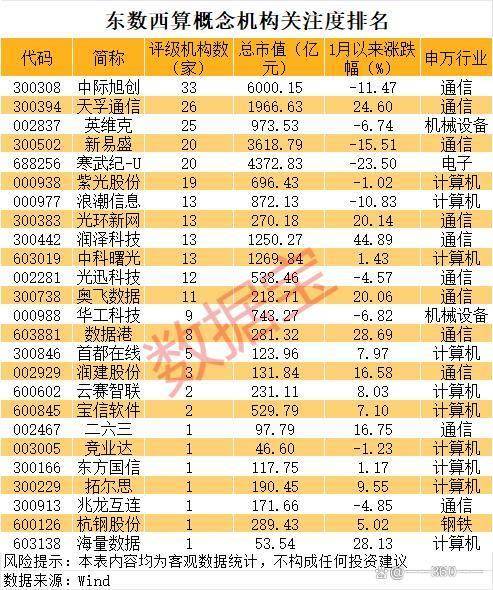 除了这些直接关联的公司,还有哪些潜在受益股呢?国信证券研报指出,近期“AI智能体正加速场景落地”预期成为市场热点,国内互联网大厂陆续启动“红包大战”争抢大模型流量入口。在此背景下,算力资源成为“卖方型市场”,成为AI应用的核心预算约束,算力链有望在强业绩支撑下重回科技投资主线。据证券时报·数据宝统计,A股市场上有25只东数西算概念股得到机构评级,中际旭创、天孚通信、英维克等个股均有20家以上机构评级,主要集中在CPO、液冷、AI算力、服务器、AIDC等领域。