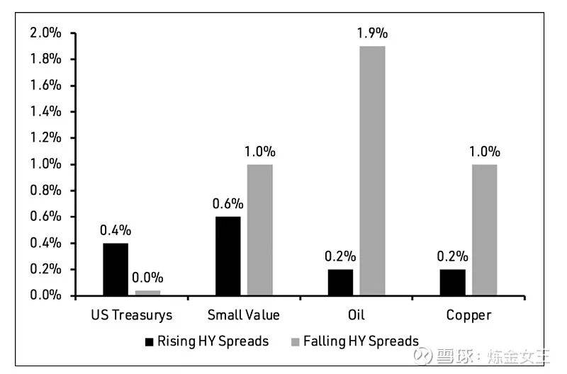 “我发现预测超额回报的最佳工具是高收益利差的水平和趋势。高收益债券利差上升预示着美国国债的回报会上升(1990-2025),利差扩大反映企业违约风险上升,投资者转向国债避险,推动国债价格上涨。美国国债收益率与名义GDP挂钩,因此GDP放缓意味着收益率下降,从而导致债券价格上涨。只有在利差上升时,美国国债才会有正回报。小盘股、石油和铜在利差下降时的回报率远高于利差上升时的回报率而在利差上升期间,石油和铜的回报几乎为正。”
